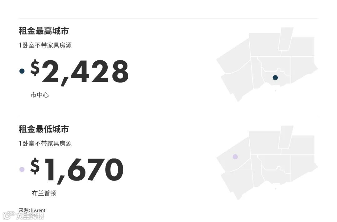 2月大多伦多租金排行榜租金最贵的城市在多伦多市中心,1卧室不带家具房源平均租金为$2428/月,而布兰普顿以月租$1670/月垫底。