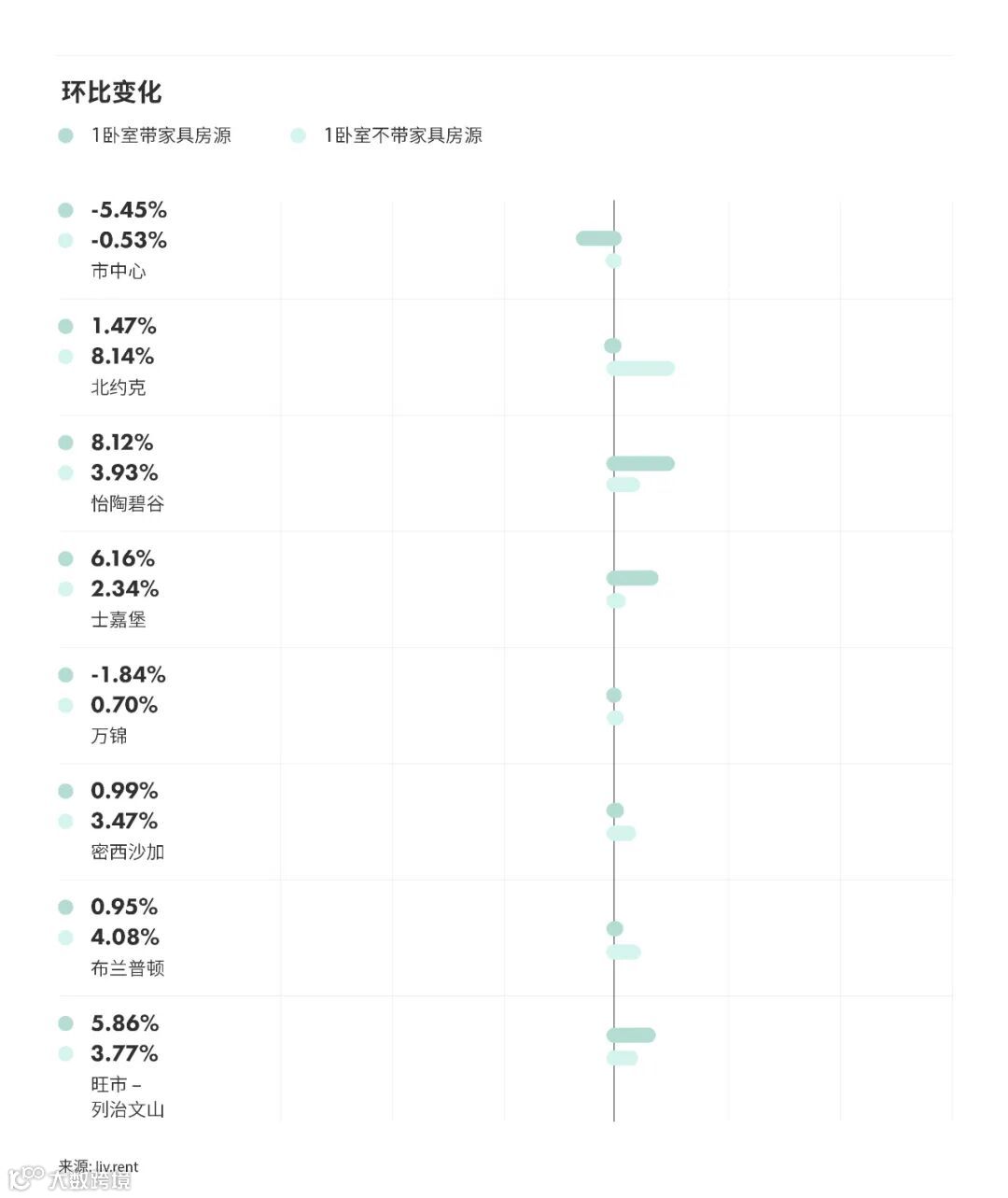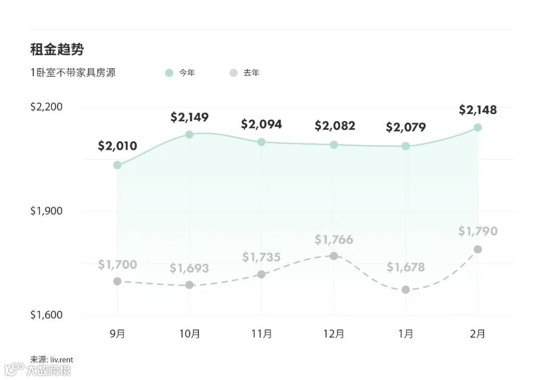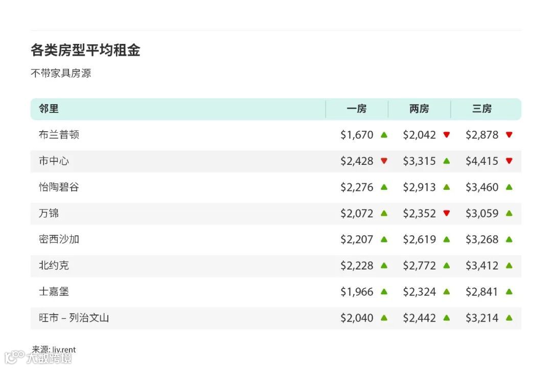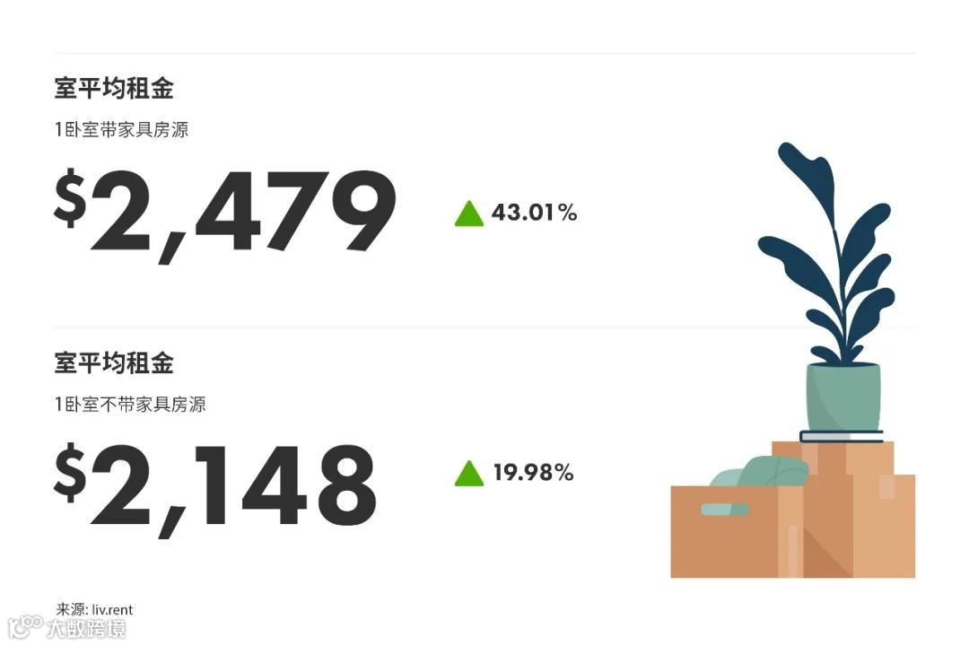 不带家具房源,一卧室平均租金$2,428/月,环比下跌近$70/月;两卧室出租单位平均租金 $3,315/月。两房单位上涨近$200/月