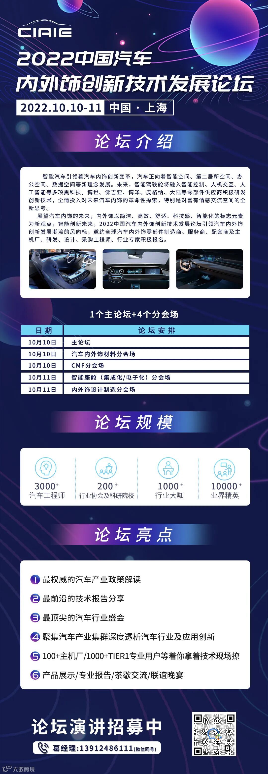 展望汽车内饰的未来,内外饰以简洁、高效、舒适、科技感、智能化的标志元素为新观点,智能创新未来,2022中国汽车内外饰创新技术发展论坛引领汽车内外饰创新发展潮流的风向标,邀约全球汽车内外饰零部件制造商、服务商、配套商及主机厂、研发、设计、采购工程师、行业专家积极报名。