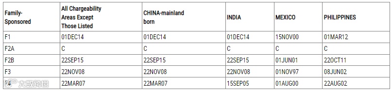 EB-5(区域中心):2015年3月22日。其中3200张签证预留名额是单独排期,新EB-5法案下的农村项目,高失业区,以及基建项目无排期。