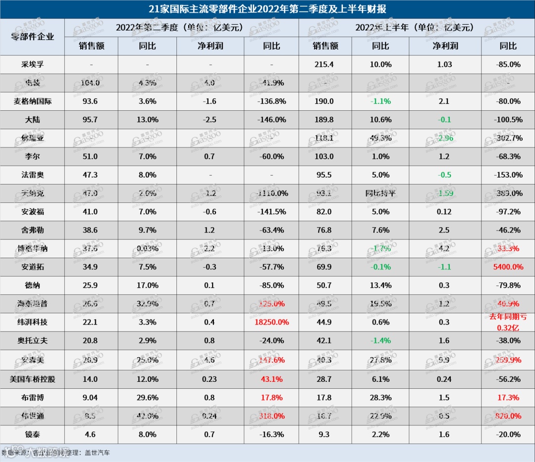 21家国际零部件企业上半年财报:采埃孚营收超200亿美元,5家出现净亏损