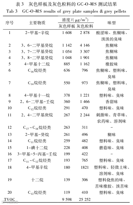 GC-O-MS测试的优势是一方面可以对样品释放的主要VOC组分进行辨别和量化,另一方面可同时借助嗅辨仪器对主要VOC组分的味型进行识别。表3展示了灰色样板及所用粒料释放的VOC组分分析结果,可见:1)主要VOC组分为各种气态烷烃类;2)样板和所用粒料释放的主要VOC组分基本一致,但样板各VOC组分浓度显着低于粒料对应组分浓度;3)在表中20种主要VOC组分中,只有12号(C17~C18烷烃类)和16号(3-甲基-5-丙基-壬烷)组分浓度虽然较高,但无明显气味特征;4)C9~C16烷烃类组分为焦糊味的主要来源。