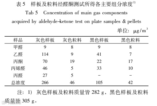 结合醛酮分析及气味评估结果,不难发现两类结果存在一定关联,例如:灰色样板的醛酮类气体浓度明显高于灰色粒料,且气味等级也高于灰色粒料;灰色粒料与黑色粒料的醛酮类气体浓度接近,且气味等级也在同一水平。然而,也有看似关联性不强的情况:对于黑色样板与黑色粒料,尽管样板的醛酮类气体浓度相比粒料也有一定程度增加,但前者气味等级却略低于后者或大体在同一水平。由此可知,仅靠醛酮类气体组分亦无法完全决定材料的气味等级。