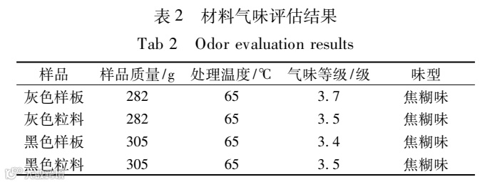 表2展示了两种颜色的样板及所用粒料的气味评估结果,四种样品的味型都是以常见的焦糊味为主。对于灰色样品,样板的气味等级(3.7级)高于所用粒料(3.5级);对于黑色样品,样板的气味等级(3.4级)略低于所用粒料(3.5级)。由于气味等级是依靠嗅觉主观判断,存在一定误差,所以对于黑色样板与黑色粒料之间气味等级0.1级的差别,可认为前者对嗅觉的刺激相对略弱,或两者大体处于同一水平。然而,对于灰色样板与灰色粒料之间气味等级0.2级的差别,其并不能完全用误差来解释,因此灰色样板对嗅觉的刺激要显着强于灰色粒料。