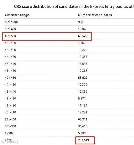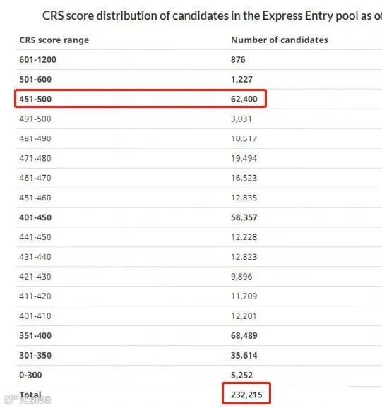 与此同时,加拿大移民局官网也公布了最新的快速通道各分数段人数。截至11月22日,快速通道池中共有申请人232,215人,其中451-500分数段的申请人共有62,400人。