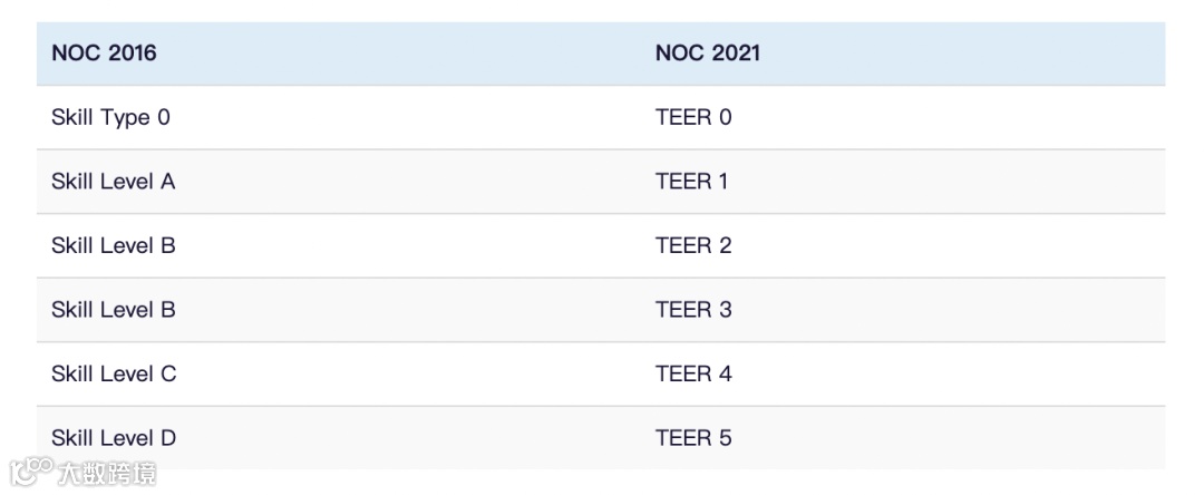 新系统根据所涉及的培训、教育、经验和责任 (TEER) 对职业进行分类。新的TEER系统修改了NOC 2016的技能级别并创建了等效的五个TEERS。
