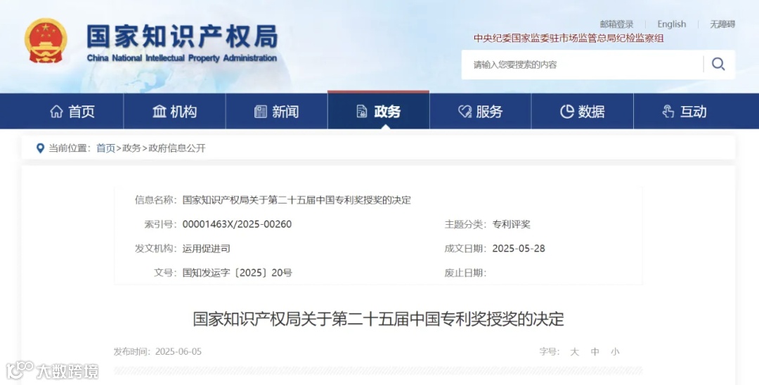 2025年6月5日,国家知识产权局公布《关于第二十五届中国专利奖授奖的决定》,