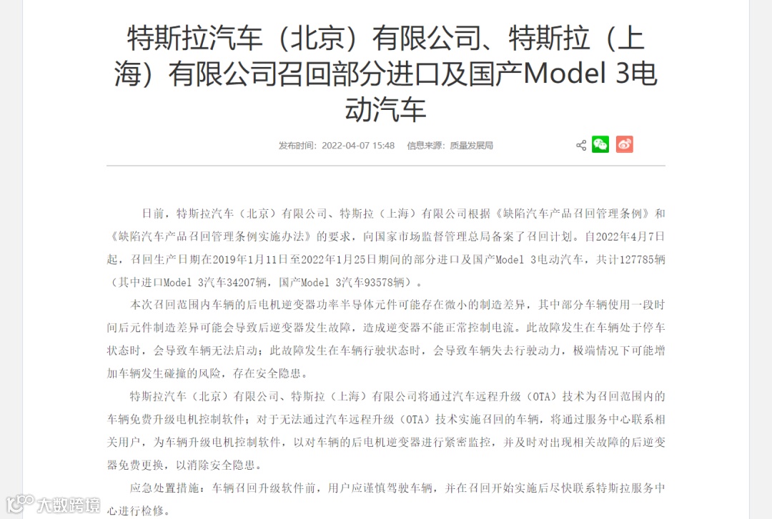 4月7日,据国家市场监督管理总局官网消息,特斯拉汽车(北京)有限公司、特斯拉(上海)有限公司向国家市场监督管理总局备案了召回计划,决定自2022年4月7日起,召回生产日期在2019年1月11日至2022年1月25日期间的部分进口及国产Model 3,共计127,785辆,其中进口Model 3汽车34,207辆,国产Model 3汽车93,578辆。据悉,本次召回的主要原因是:召回范围内车辆的后电机逆变器功率半导体元件可能存在微小的制造差异,其中部分车辆使用一段时间后元件制造差异可能会导致后逆变器发生故障,造成逆变器不能正常控制电流。此故障发生在车辆处于停车状态时,会导致车辆无法启动;发生在车辆行驶状态时,会导致车辆失去行驶动力,极端情况下可能增加车辆发生碰撞的风险,存在安全隐患。