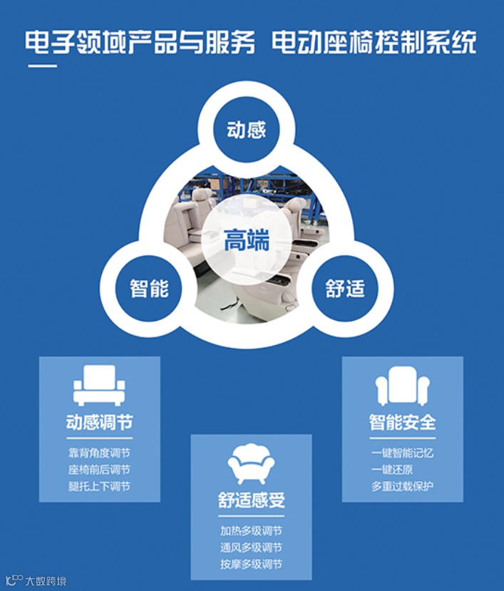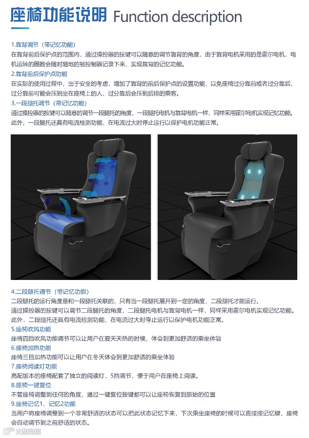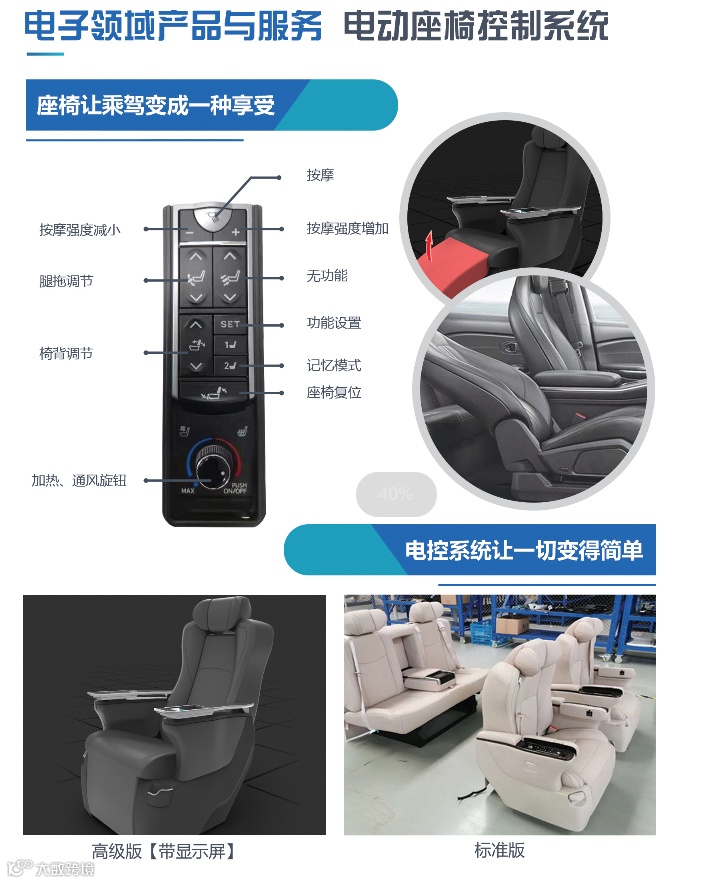 将电动座椅与车载电脑结合在一起,增加座椅的记忆功能,对座椅给中信息参数实现智能化管理,只需要按动一个键钮,便轻松获得以前存储的适合个人需要的设定。一般有两到四个记忆组数。现有标准版和高级版(带显示屏),且支持定制化服务。