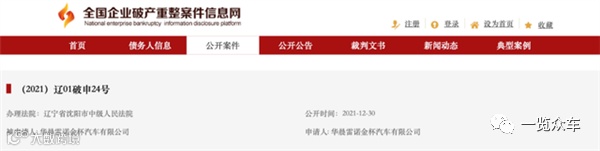 12月30日,据多家媒体报道,全国企业破产重整案件信息网显示,华晨雷诺金杯有限公司申请破产,案号为(2021)辽01破申24号,经办法院为辽宁省沈阳市中级人民法院。该公司成立于1991年7月,法定代表人吴小安,注册资本约17.96亿美元,由沈阳金杯汽车工业控股有限公司、雷诺简化股份有限公司共同持股。