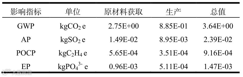 确定本次评价的目的和范围,并在清单分析和影响评价的基础上,得到了一个左前翼子板的全球增温潜势(GWP 100a)、酸化潜势(AP)、光化学氧化剂生产潜势(POCP)、富营养化潜势(EP)和臭氧层损耗潜势(ODP)这5 个方面的指标值[4]。由于计算得到的ODP 的值很小,本研究中重点讨论前四个方面的环境影响,产品生命周期环境影响汇总情况如表4 所示。