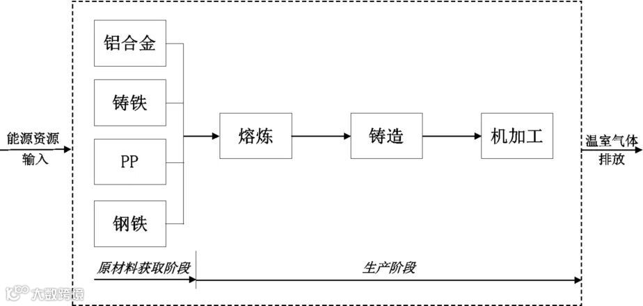 单个零部件产品生命周期碳排放的系统边界包括原材料获取阶段和生产阶段。在实际核算过程中,首先需要确认零部件产品的系统边界。以发动机产品举例:其他零部件参照执行。