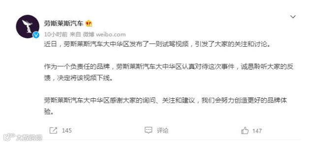 作为一个负责任的品牌,劳斯莱斯汽车大中华区认真对待这次事件,诚恳聆听大家的反馈,决定将该视频下线。劳斯莱斯汽车大中华区感谢大家的询问、关注和建议,我们会努力创造更好的品牌体验。