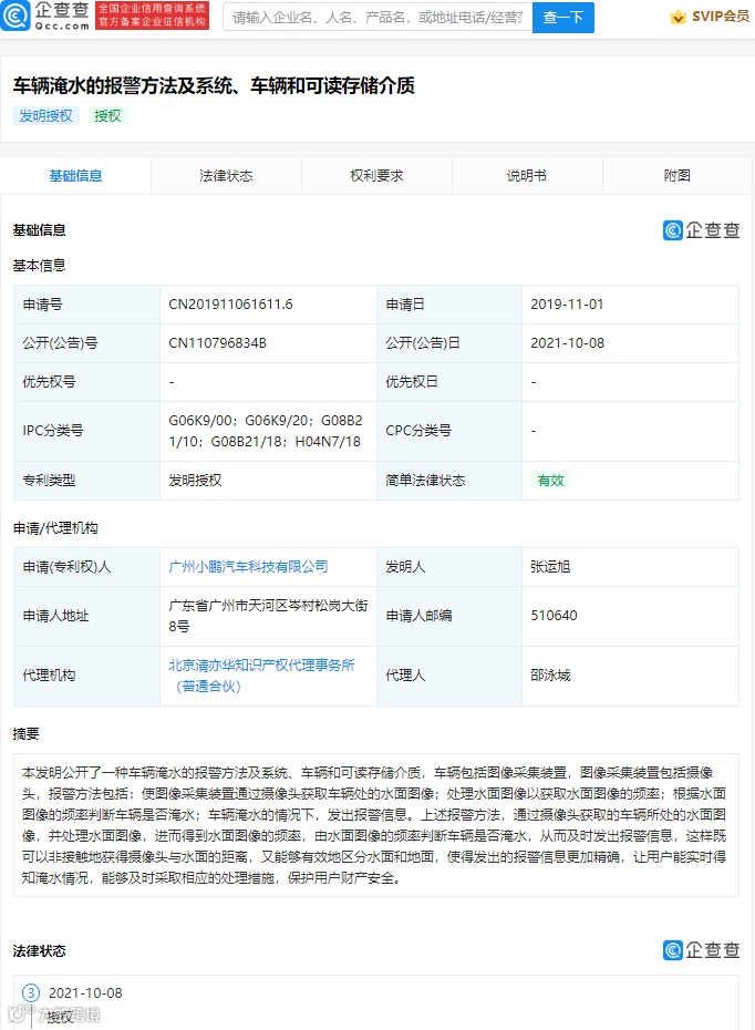 如何减少此类天灾带来的损失,小鹏的一项新专利或许能帮忙。企查查 App 显示,10 月 8 日,广州小鹏汽车科技有限公司“车辆淹水的报警方法及系统、车辆和可读存储介质”专利获授权,公开号为 CN110796834B。