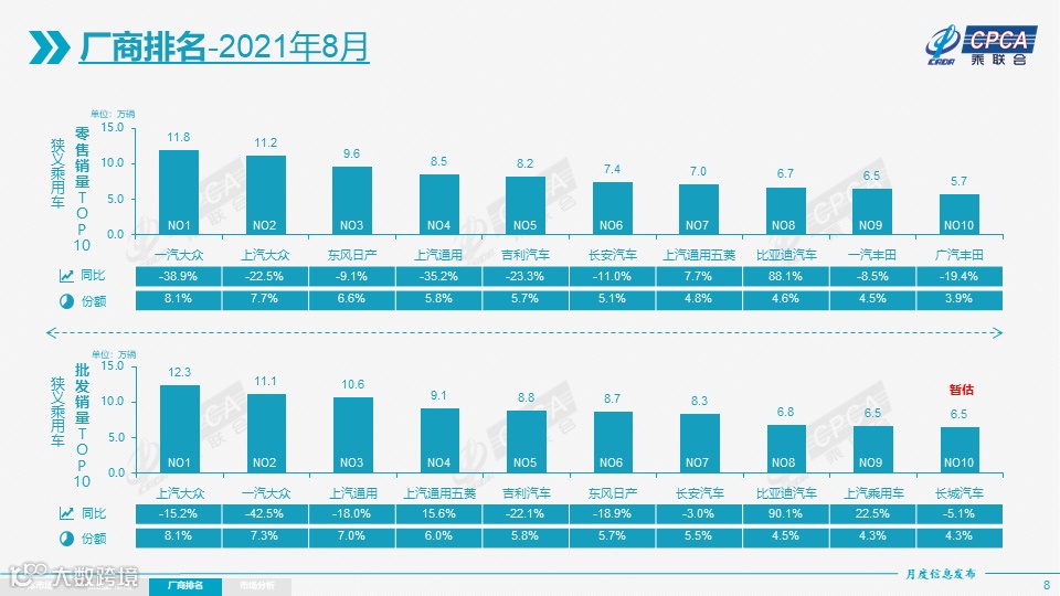 自主品牌(七家,较上月增加了上汽乘用车):七家企业8月份市占率为29.8%,较上月提升了1.6个百分点,这是近10年来自主品牌入榜厂商数最多的一次。
