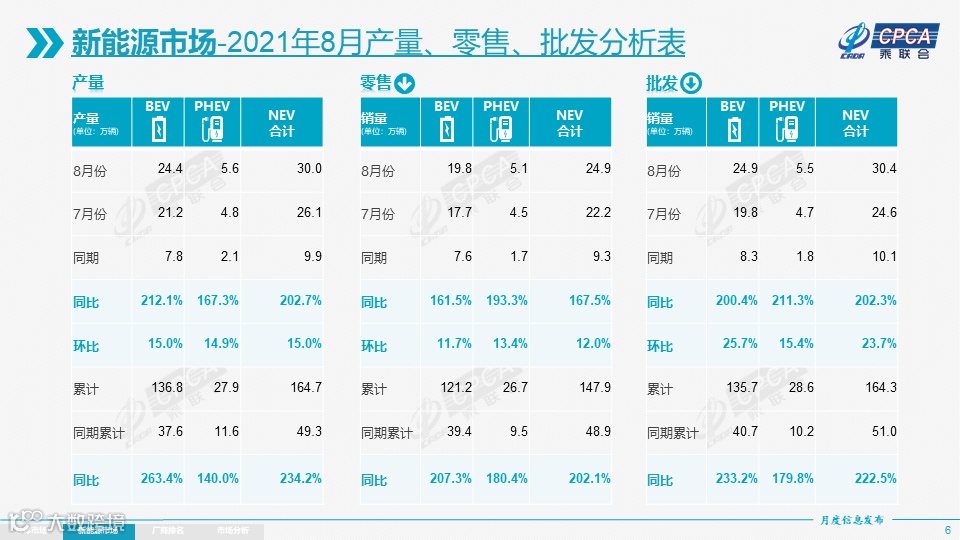 新能源:8月新能源乘用车批发销量达到30.4万辆,同比增长202.3%,环比增长23.7%。1-8月新能源乘用车批发164.3万辆,同比增长222.5%。8月新能源乘用车零售销量达到24.9万辆,同比增长167.5%,环比增12.0%。1-8月新能源车零售147.9万辆,同比增长202.1%。与传统燃油车走势形成强烈差异化的特征,实现对燃油车市场的替代效应,并拉动车市向新能源化转型的步伐。