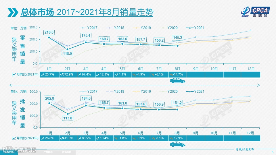 零售:2021年8月乘用车市场零售达到145.3万辆,同比下降14.7%,而且相较2019年8月下降7%,增速偏弱。