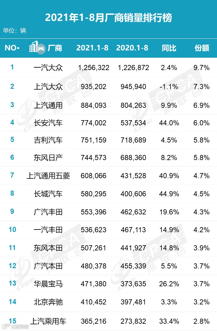 德系车(三家,与上月一致):一汽大众、上汽大众、华晨宝马三家企业8月份市占率为19.7%,较上月提升1.4个百分点。
