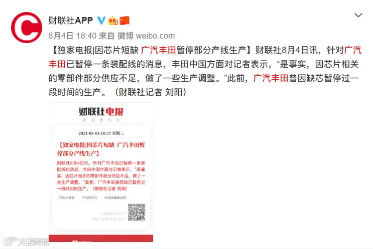 不过,近日有媒体报道,丰田中国广州工厂的一条装配线已暂停生产。对此,丰田中国向相关媒体回应,“是事实,因芯片相关的零部件部分供应不足,做了一些生产调整。”据第一财经报道,一汽丰田和广汽丰田因芯片短缺各有部分产线暂停生产,不过两家公司均没有透露芯片短缺导致了哪些车型的减产,以及损失的具体产量。
