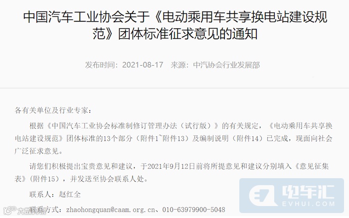 电车汇消息:8月17日,中国汽车工业协会官网发布关于《电动乘用车共享换电站建设规范》团体标准征求意见的通知,针对换电平台和装置技术要求、电池包通信协议、车辆识别系统要求等多个方面发布征求意见稿。