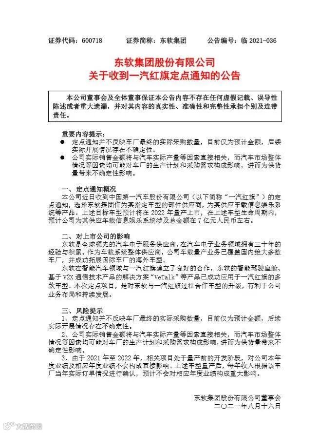 预计金额约7亿元,东软集团成一汽红旗定点供应商