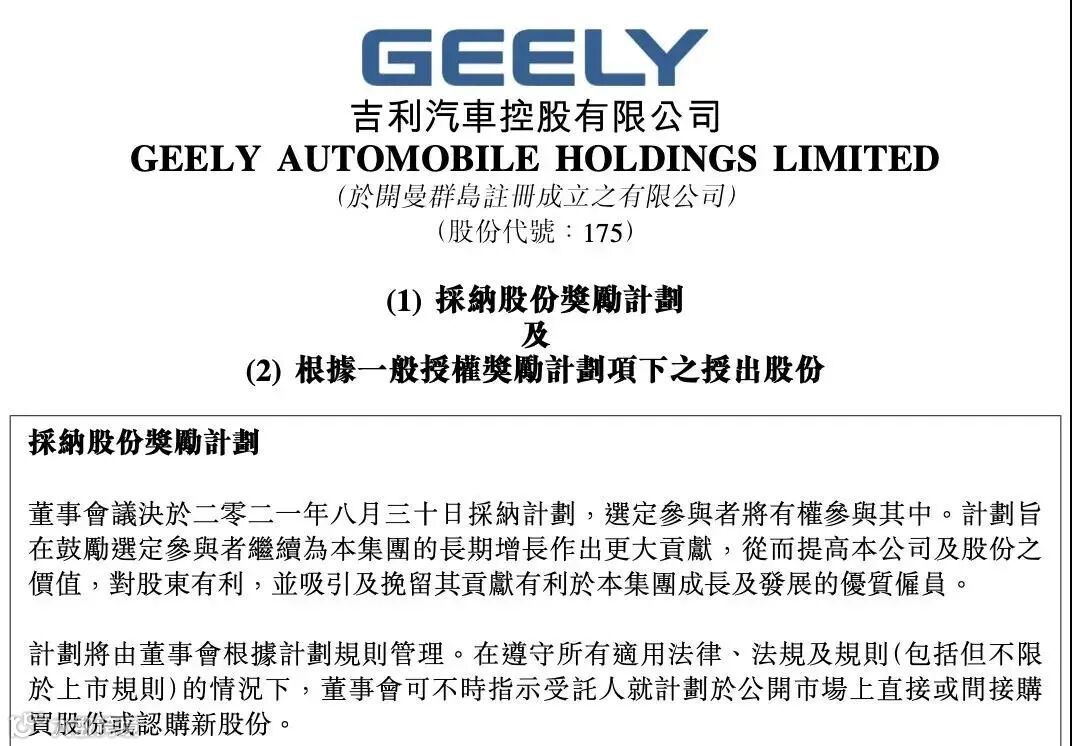 吉利汽车向万名员工授予37亿股权激励!共同富裕计划细则公布