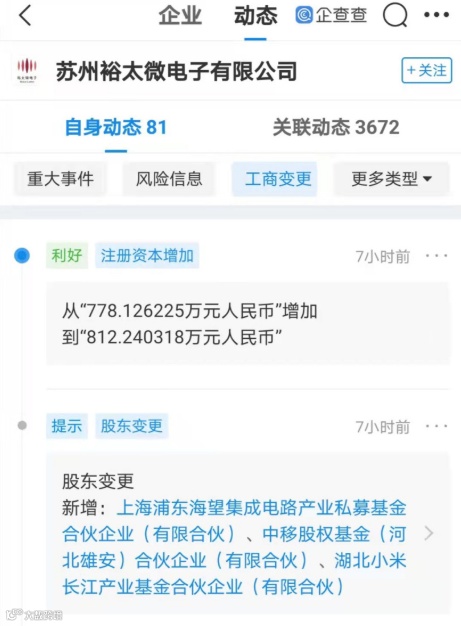 企查查 App 显示,近日,小米再次进行汽车相关投资。苏州裕太微电子有限公司发生工商变更,新增股东湖北小米长江产业基金合伙企业(有限合伙),同时公司注册资本由 778.13 万元人民币增加至 812.24 万元人民币。企查查信息显示,裕太微电子是一家车载核心通讯芯片研发商,公司成立于 2017 年,法定代表人为欧阳宇飞,经营范围包含:电子、汽车、工业自动化、计算机领域的技术开发、技术咨询、技术服务、技术转让等。