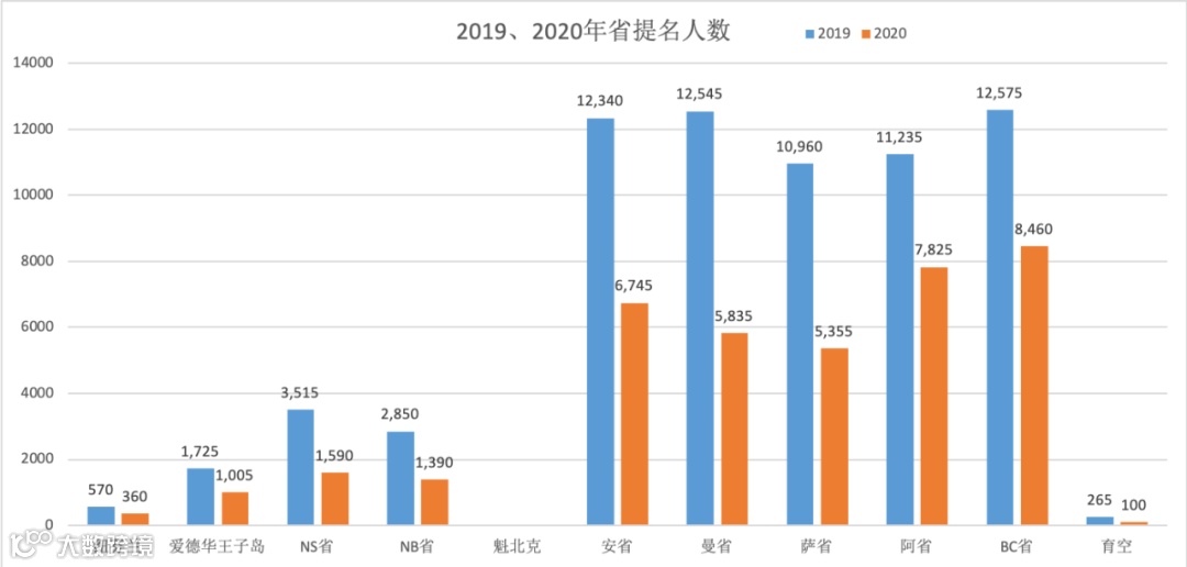 相比之下,东部海洋省的提名不是数量级的,这也是联邦设立大西洋项目的初衷。另外,由于魁省移民政策独立于联邦和其他12个省,部分数据归属于联邦项目,不以此数据进行统计。
