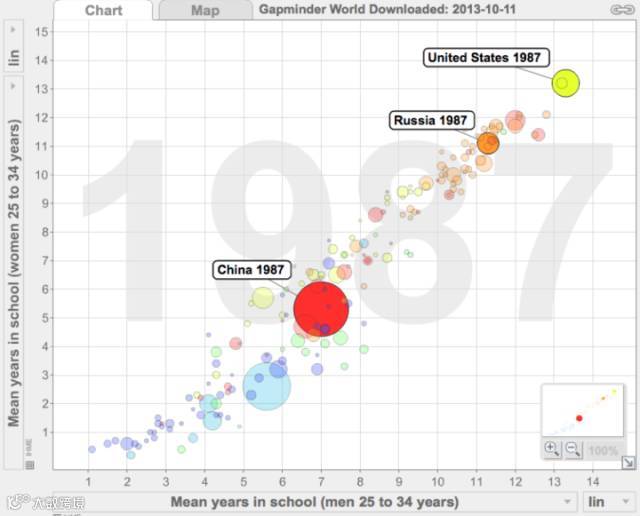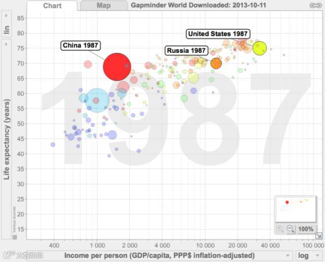 但如果是相比同时期的中国,苏联的领先优势不是一点半点,跟随作者鱼非鱼看看一些苏联当时的一些基本国情。拿1987年,苏联危机出现前一年为标准,根据下图中gapminder网站提供的数据(图表也是Gapminder软件截图)。