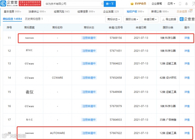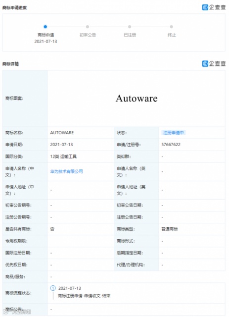 【TechWeb】企查查APP显示,近日,华为技术有限公司新增“Autoware”商标申请信息,国际分类涉及科学仪器、运输工具、设计研究,目前商标状态均为“注册申请中”。