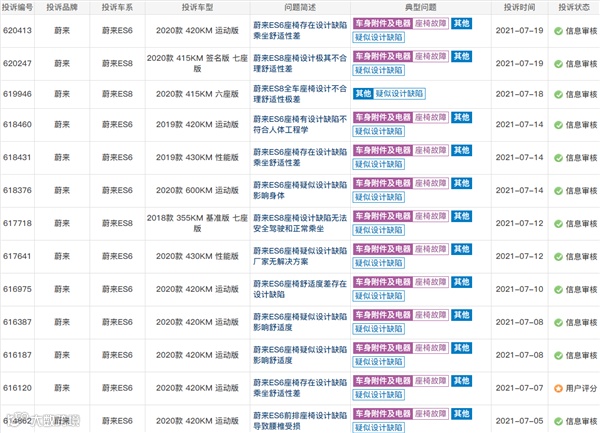 投诉涵盖蔚来旗下ES8、ES6和EC6三款已上市的全部车型,截至目前共有43宗,其中ES6二十八宗,ES8七宗,EC6八宗,投诉的问题基本为“车身附件及电器 座椅故障 其他疑似设计缺陷”。