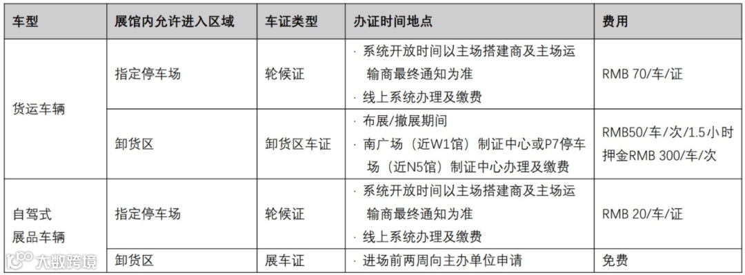 货运车辆必须提前办理《轮候证》方可进入展馆周边区域,未见此证的货运车辆或未按照规定时间驶入围合区域的,将 被交警、保安驱离围合区域,甚至面临扣分罚款。之后须凭《卸货区车证》方可进入展馆卸货区卸货。