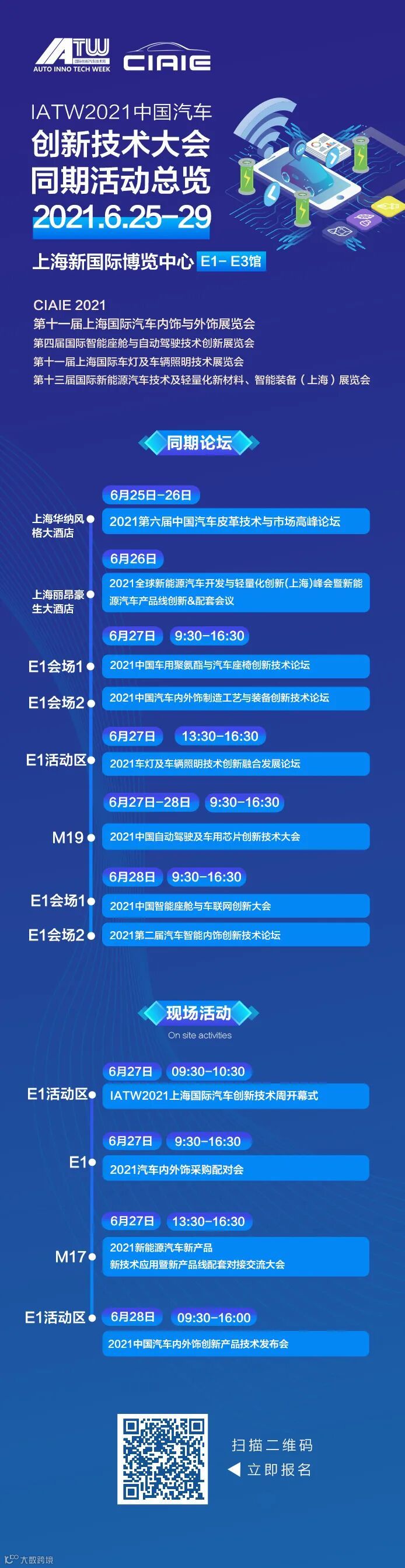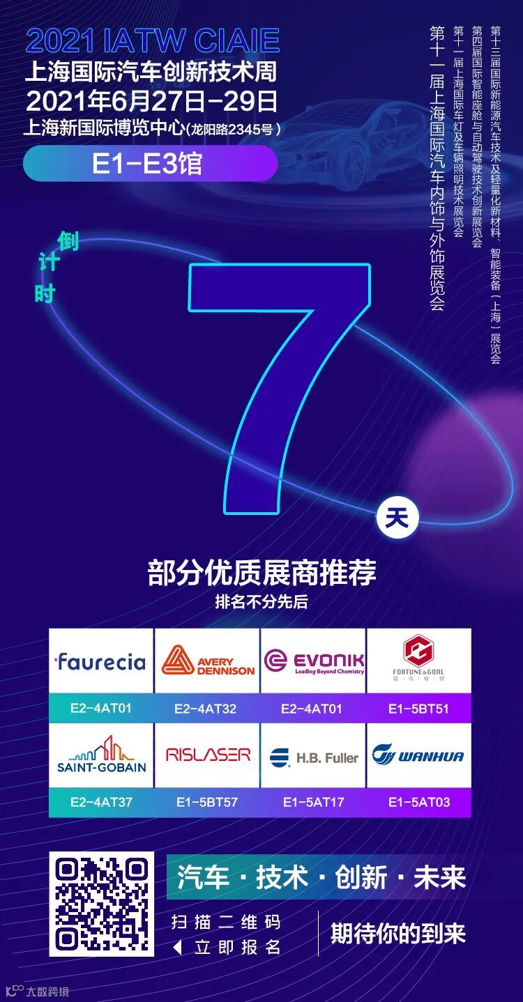有着行业风向标之称的IATW 2021上海国际汽车创新技术周 & CIAIE 2021第十一届中国上海国际汽车内饰与外饰展览会即将于6月27-29日在上海新国际博览中心E1-E3馆盛大举办。距离展会开幕仅剩7天,长按下方图片识别二维码,抓紧时间预登记。