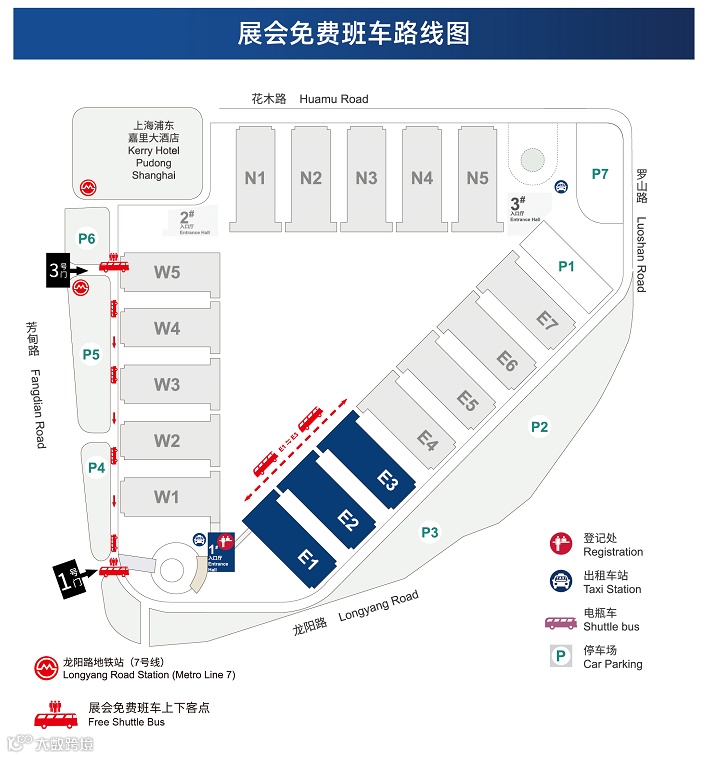 为了大家能够更加便捷的进入展馆1号报到大厅,在展馆3号门W5馆外安排了免费穿梭巴士,接送大家前往1号入口厅,免费班车接送时间为6月27-28日09:00-17:00。