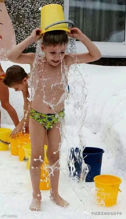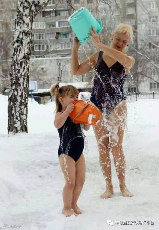 在冰天雪地里,一个家长正在跟孩子一起把冷水浇在自己身上。尽管在这样的天气下,水的温度其实比室外温度高,因为水温到达零下会结冰,但是对于小孩子来说,淋完后就肯定很冷了!而且都没有穿衣服!不愧是战斗民族啊!