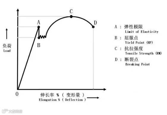 应力达到C点后材料抵抗变形力明显降低,迅速发生塑形变形直至断裂点D。