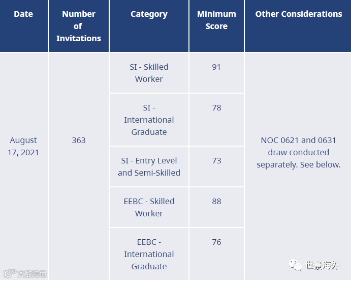 BC省技术移民项目针对NOC0621、0631之外的岗位,邀请了363人,其中BC省快速通道-技术工人类(EEBC)最低邀请分88分;BC省快速通道-留学生类(EEBC)最低邀请分76分。