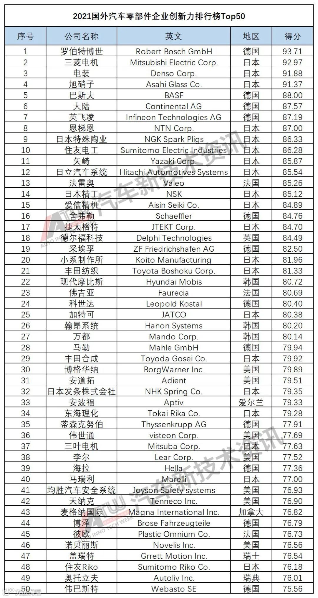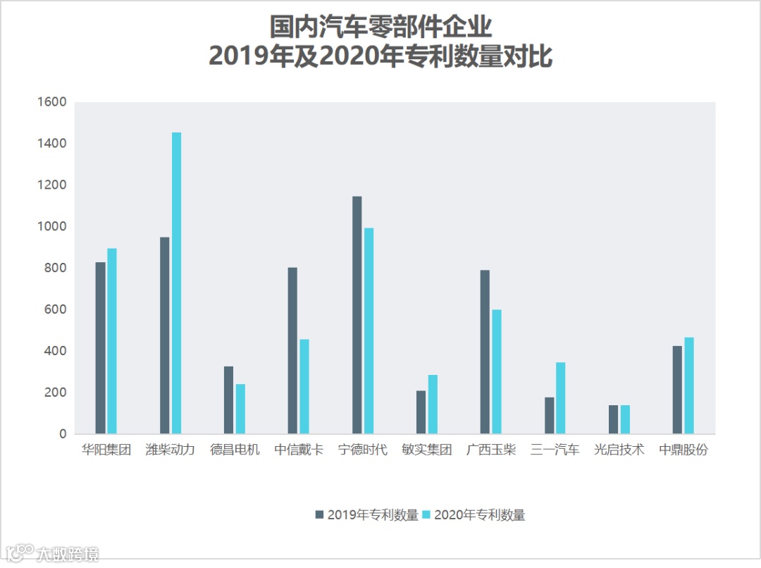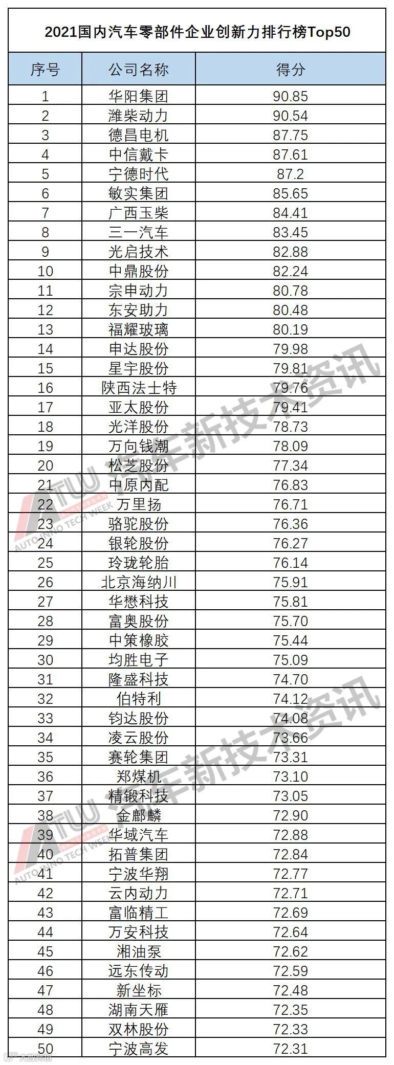 而在国内汽车零部件企业创新力排行中占据榜首的为华阳集团,排在之后进入前十的企业分别为:潍柴动力,德昌电机,中信戴卡,宁德时代,敏实集团,广西玉柴,三一汽车,光启技术,中鼎股份。