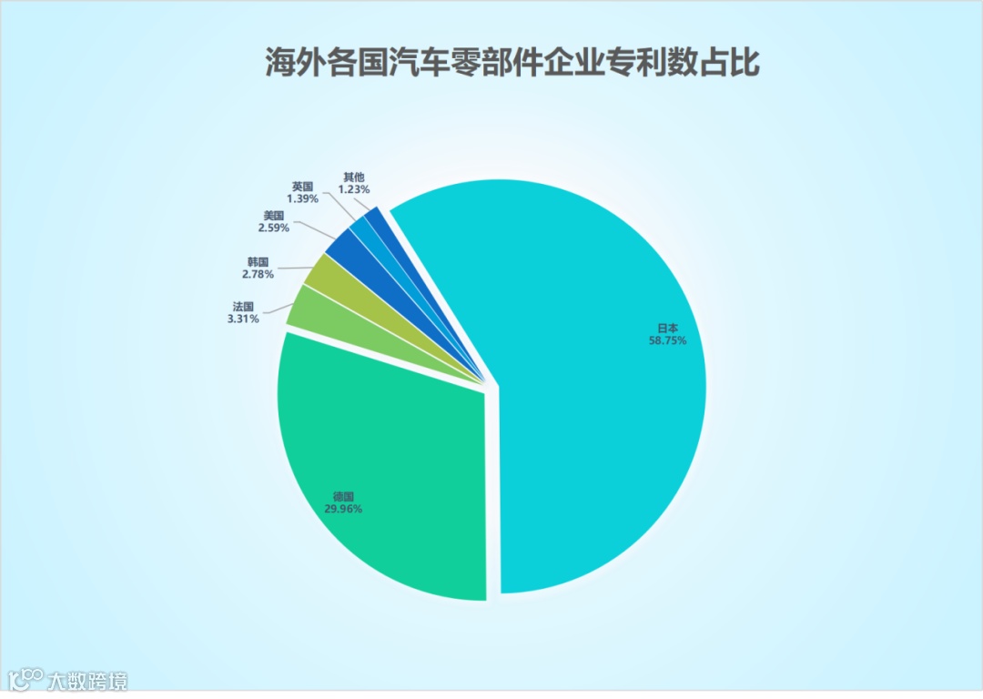 而在国外汽车零部件企业创新力排行榜中,拔得头筹的为Robert Bosch,专利总数高达13w条,专利总价值超过102亿美元。从国家分布来看,日本有20家企业入榜,专利数量占比58.75%,德国12家企业入榜,专利数量占比29.96%;仅日德两国,占据专利总数已接近90%。