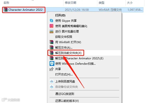 1.下载【Character Animator CC2022】软件安装包,鼠标右击压缩包选择【解压到当前文件夹】。