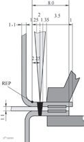 图6c点焊和激光焊关于翻边结构对应的翻边结构宽度要求,激光焊翻边尺寸要求为6~8mm,点焊翻边尺寸要求为15~18mm。