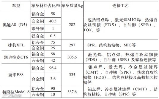 表3 几种典型轻量化车型铝合金应用对比和连接工艺说明