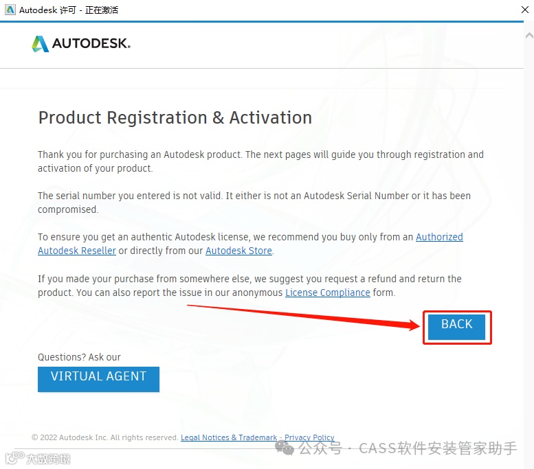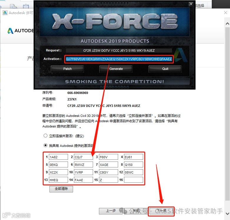 39.全部选中Activation中生成的激活码,使用Ctrl+C键或者鼠标右击复制生成的激活码,然后粘贴激活码至我具有Autodesk提供的激活码方框中,点击【下一步】。