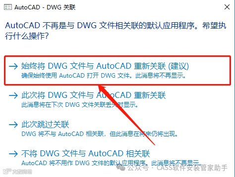 13.点击【始终将DWG文件与AutoCAD重新关联(建议)】。