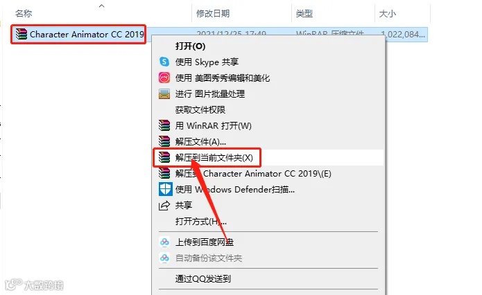 1.下载【Character Animator CC2019】软件安装包,鼠标右击压缩包选择【解压到【Character Animator CC2019】文件夹】。
