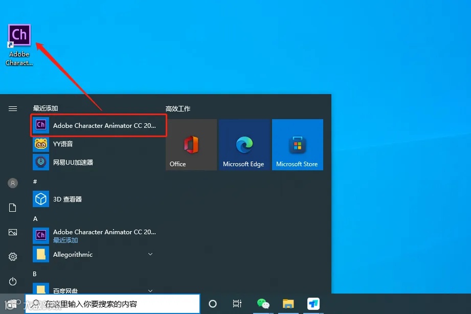 11.在开始菜单中找到【Character Animator CC2019】软件,然后鼠标拖拽到桌面上即可创建桌面快捷方式。
