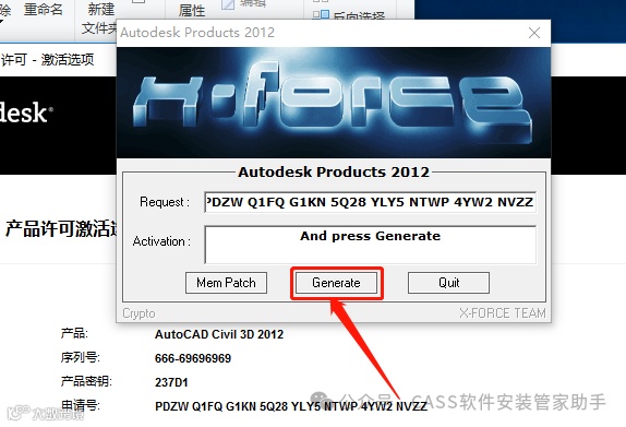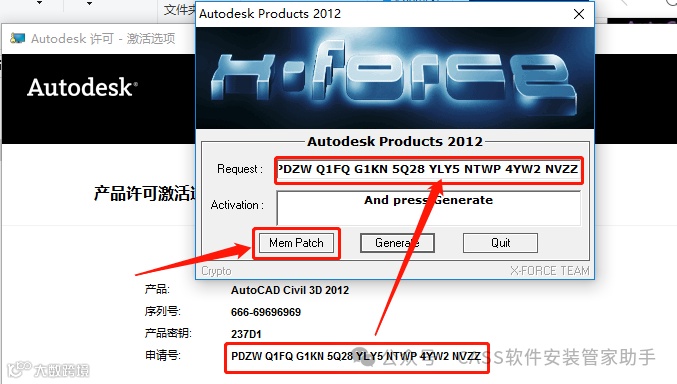 26.使用Ctrl+C键复制申请号,然后使用Ctrl+V键粘贴到注册机里面的【Request】中(记得删除原请求码中的内容),然后点击注册机左下角的【Patch】。
