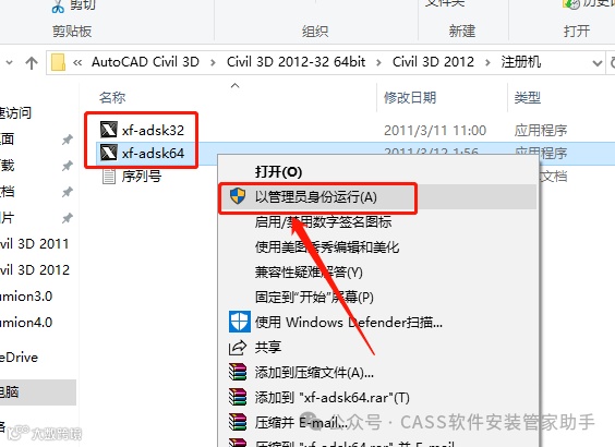 24.选中【xf-adsk64】注册机,鼠标右击选择【以管理员身份运行】。