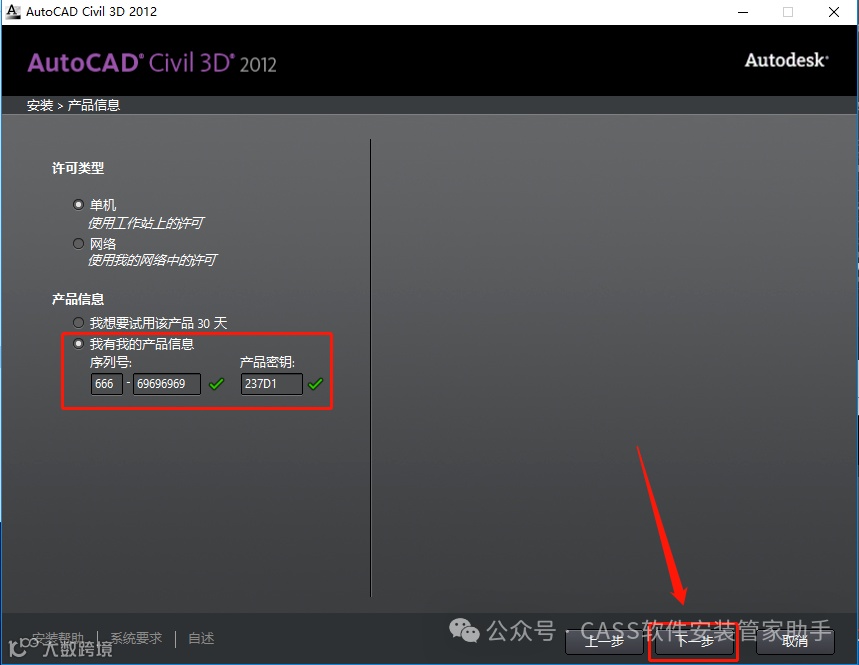 8.输入序列号:666-69696969,产品密钥:237D1,输入好后点击【下一步】。