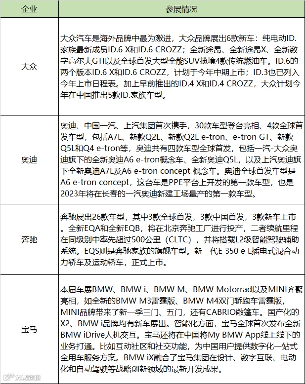 本次参展的主要跨国公司及其在中国的合资企业纷纷加大了投入力度,均有重要新能源、智能化产品推出。但不管是奥迪大众还是奔驰宝马,即将量产的车型和期货车都没有有显著竞争优势的产品和反超特斯拉乃至新势力的迹象,如果这些传统豪门不尽快在纯电动汽车市场实现产品和销量上的突破,也许其中部分品牌有进一步掉队的风险,尽管其在燃油车领域的优势还能在相当一段时间保证他们总销量和财务指标上的优势。
